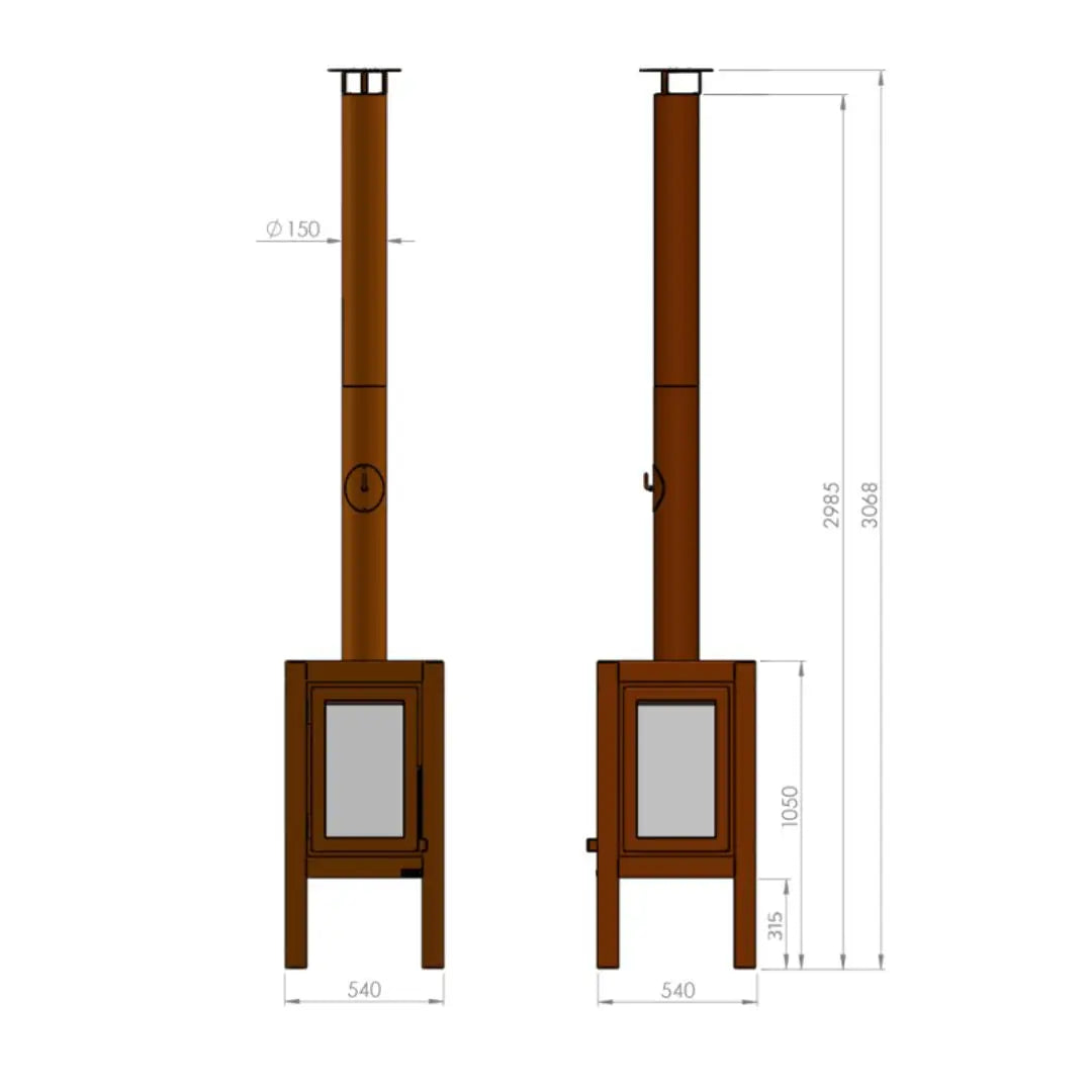 As a closed outdoor fire it has safety benefits over a chiminea and the sparks are contained during the burn cycle. The long chimney is included as standard and is made up of two 1 metre sections plus a rain cowl, providing both height and effective smoke control straight out of the box. The chimney also ensures smoke is dispersed from the immediate area allowing a more pleasurable experience and less sore eyes than you get sitting around a chiminea!