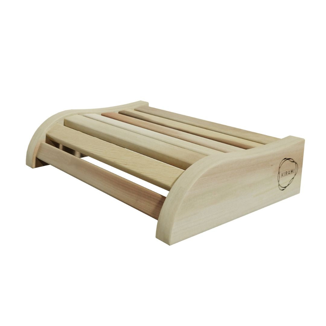 Crafted from high-quality giant thuja wood, the headrest complements the natural materials used throughout the Kirami FinVision® sauna range. Its smooth, rounded shape and carefully finished design make it both comfortable to use and visually refined, adding a subtle touch of luxury to the sauna interior.