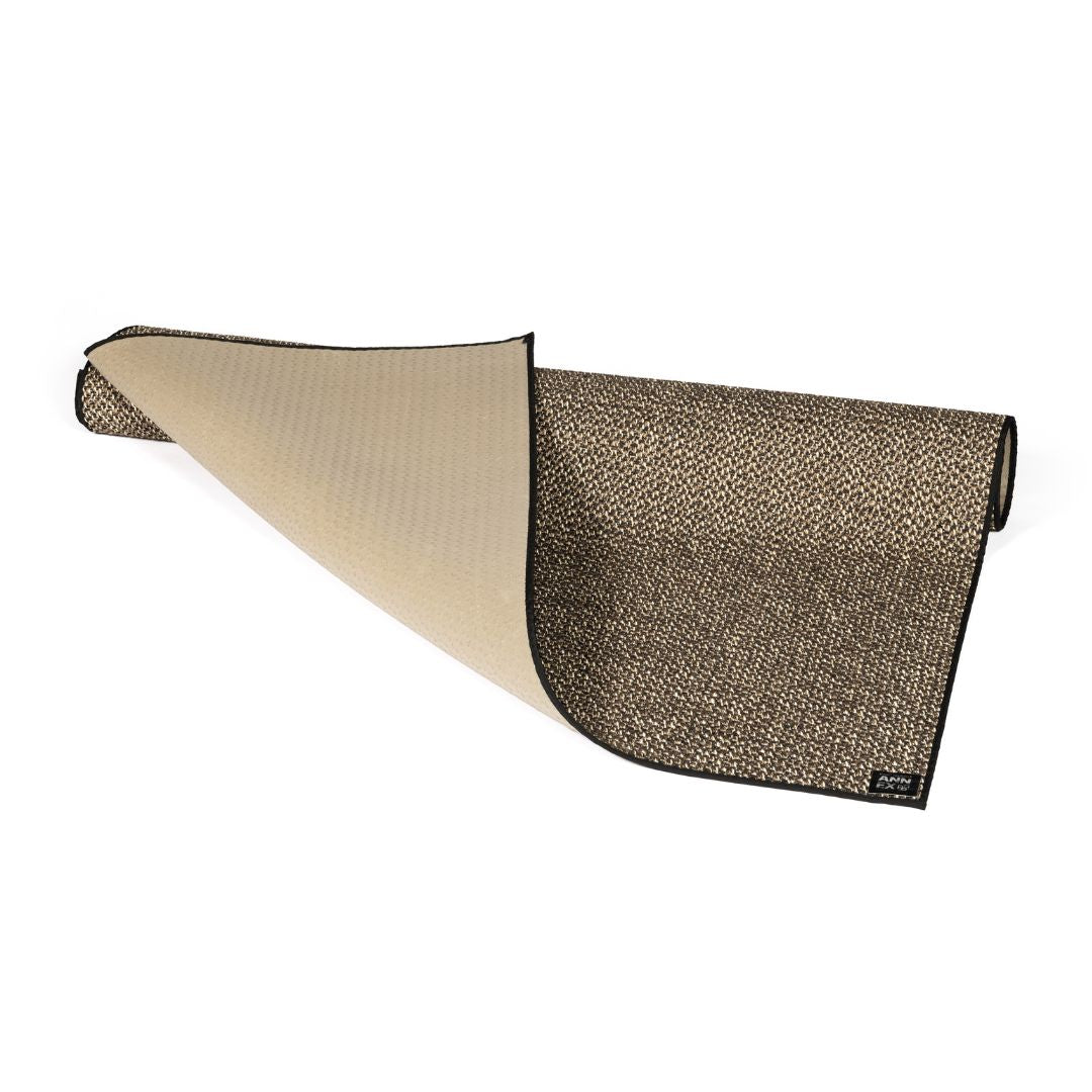 The rug measures approximately 1.5 m × 1.9 m and covers most of the lounge floor while leaving the wooden edges visible for a clean, considered finish. The surface features a multi-tone blend of black and beige, finished with a subtle black border to complement the Misty interior. Its 6.5 mm thickness provides comfort underfoot while also helping improve room acoustics by reducing sound reflection.